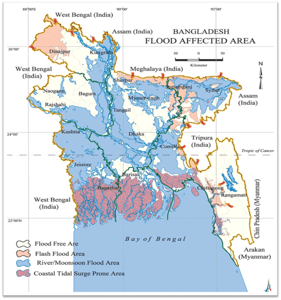 lood is a natural disaster, and it is an overflow of water that submerges land that is usually dry. Flooding may occur overflow of water from water bodies, such as a river, lake, or oceans, in which the water overtops or breaks levees, resulting in some of that water escaping usually its boundaries. Bangladesh experience four types of floods, flash floods, riverine floods, rain floods, and storm floods. The country consists of the flood plains of the Ganges, the Brahmaputra, and the Meghna River, are generating a basin named GBM, which cover almost of the area of this country and drained the huge runoff through this three river system. Flash flood occurs in the northern and eastern rivers. Riverine floods from the spilling of Major River and tributaries and it’s generally rise and fall slowly over 10-20 days or more. It can cause extensive damage to property and loss of life. Storm surge floods occur in coastal areas of Bangladesh. Which consists of large estuaries, extensive tidal, and low lying islands. River floods occurred by high intensity rainfall of long duration in the monsoon season. From year to year, the extent and depth of rain water flooding varies with the monsoon.