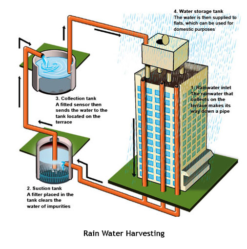 The system for the multi storied buildings are quite similar to the previous system. The rainwater will be collected on the roof and will be collected to a suction tank on the ground through a number of pipes. A filter will be fixed in this tank to remove the impurities from rainwater. From suction tank the water will be transferred to a collection tank. The collection tank may be fitted with level sensor switches. When the level of the water goes high the float switch will start the transfer pump and send water to the roof top tank of the apartment and this water will be used by all the people living in the complex. It will be a good practice to initially drain the water to get rid of impurities for few minutes and then start the collection of rain water. This water can be directly used for all the washing purpose but for drinking and cooking this water should be boiled or filtered with reverse osmosis or chlorination process. The rainwater does not contain many essential salts and minerals so it may be required to add salt and minerals with rainwater to make it healthier.
