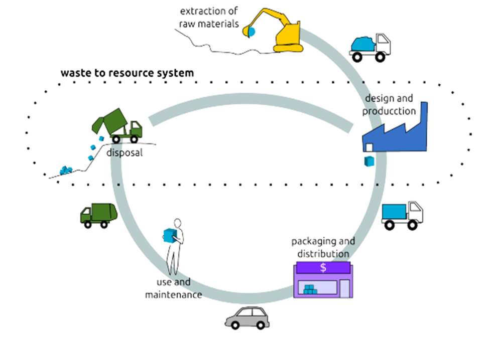 This figure shows that, extracting of raw materials- designed and production- packaging and distribution- use and maintenance- disposal- Waste to resource system. Local authorities are responsible for the collection and treatment of waste. Extracting of raw materials in the world that are accumulated. Then the waste transportation and separation in them. The waste hierarchy is the evaluation of process that can protect the environment.